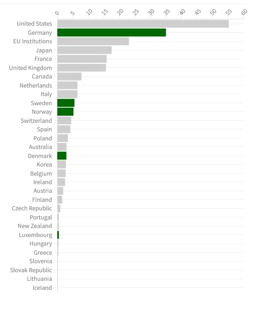 OECD (2023). Official Development Assistance (ODA) in 2022, by members of the Development Assistance Committee (preliminary data). Disponible en: https://public.flourish.studio/story/1882344/